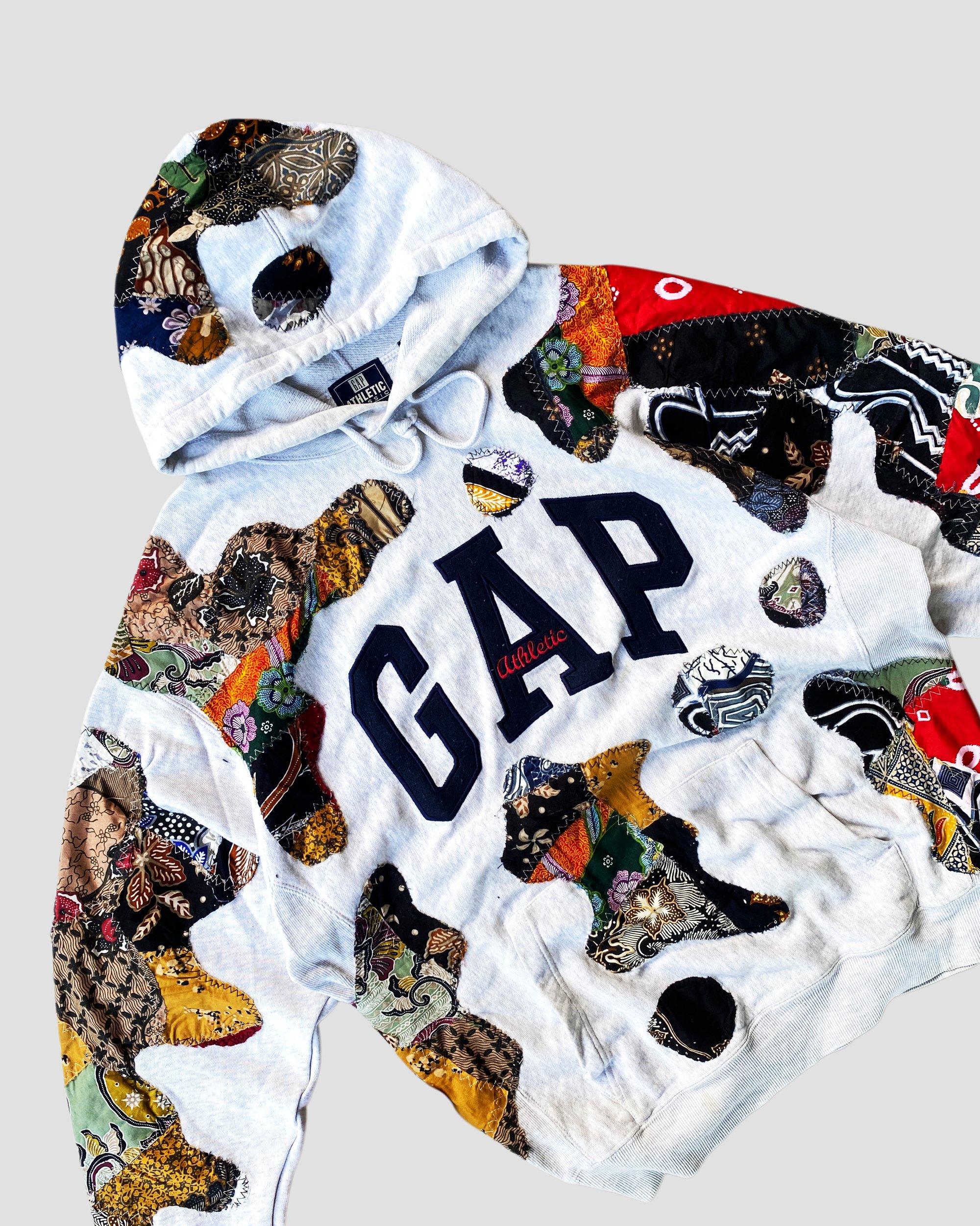 -Upcycled GAP Hoodie, combining elements of several materials and mashing them into one, cut & sew